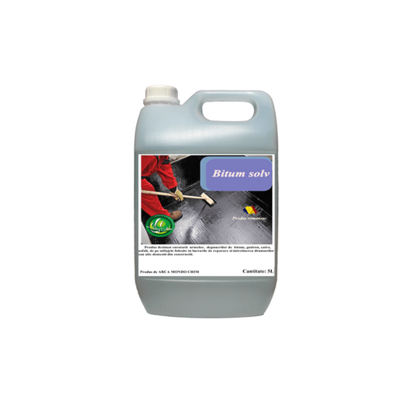 BITUM-SOLV ARCA LUX SOLUTIE PENTRU CURATAREA DEPUNERILOR DE BITUM, GUDRON, ULEI, ASFALT UTILIZARE: BITUM SOLV ARCA LUX este un produs lichid destinat curatarii urmelor, depunerilor de biutm, gudron, catran, asfalt, grasimi, ulei, vaselina, pacura de pe diverse suprafete, uneltele si utilajele folosite in lucrarile de reparare si intretinere a drumurilor sau alte domenii din constructii : repartizoare asfalt, finisoare asfalt, gudronatoare, pompe de bitum, bene de bitum, benzi de transport, diferite suprafete metalice, lopeti, spatule, maiuri, etc. PROPRIETATI: Proprietati de penetrare si dizolvare rapida a urmelor, depunerilor de biutm, gudron, catran, asfalt,vaselina, pacura si degresarea diverselor suprafete. Produs biodegradabil. Produs sigur pentru orice tip de suprafata metalica. Produsul este un lichid inflamabil (temperatura de inflamabilitate >250C) si combustibil. Evitati contactul cu orice sursa de aprindere. INDICATII DE UTILIZARE: Se utilizeaza nediluat. In cazul incarcaturilor grosiere, se recomanda curatarea mecanica (cu peria, spaclu) inainte de aplicarea produsului. Produsul se aplica prin pulverizare, sau cu o perie, pensula, carpa, pe suprafata care trebuie curatata. Se lasa sa actioneze 10 – 15 minute, pentru ca substantele active sa penetreze si sa dizolve depunerea si apoi se spala cu apa. Daca este nevoie se repeta aplicarea. Consumul de produs depinde de gradul de murdarire, vechimea si consistenta depunerii de bitum (tipul de bitum). COMPOZITIE: Solvent petrolier tip white spirits 40 -60 %, solventi aromatici (alchili benzeni) < 35 %, alcooli < 15%, surfactanti neionici sub 5 %. CARACTERISTICI TEHNICE: ASPECT(la 25 grade): lichid transparent, omogen CULOARE: incolor sau slab galbui MIROS: caracteristic PUNCT DE INFLAMABILITATE > 250C DENSITATE: 0,8 -0,85 g/cm3