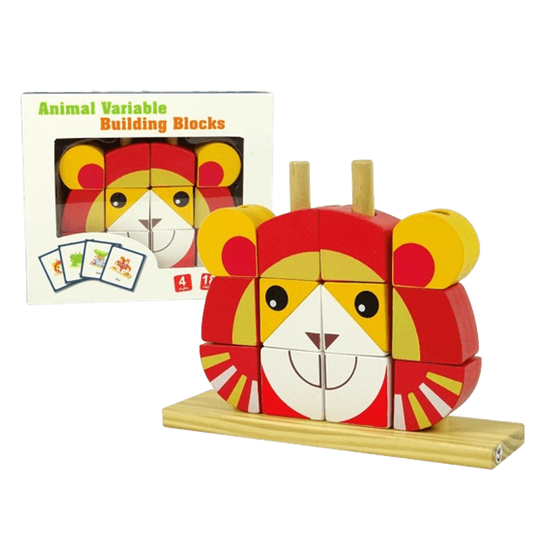 Este un joc de construit cu ajutorul caruia cei mici isi poate folosi imaginatia din plin in formarea constructiilor si antrena rabdarea, cu o tematica foarte apreciata de copii: Animale . Cuburile au detalii coloristice foarte captivante si poate inspira copiii la diverse jocuri de rol, de creativitate, educative. Cuburile sunt mici, nu necesita spatiu de depozitare mare. Prin manevrarea cuburilor se dezvolta in primul rand coordonarea mana-ochi. Setul include o baza cu 4 piloni pe care copii vor insera cele 12 piesele. Pur si simplu plasati blocurile in diferite configuratii pe pilonii proeminenti pana cand se formeaza un model . Setul permite copilului sa realizeze mai multe forme folosind piesele si cartonasele cu modele. Cu ajutorul celor 12 piese copii pot efectua constructii diferite. Este un joc prin care cei mici vor putea sa-si materializeze ideile. Poate fi folosit ca blocuri de constructie (fara a fi nevoie de suport). Cand copiii si parintii se concentreaza asupra jocului, acesta devine un joc interactiv excelent care promoveaza o conexiune intre ei. Copiii pot duce aceasta jucarie oriunde doresc si este usor de transportat. In ciuda dimensiunilor mai mici, lemnul este gros si rezistent.