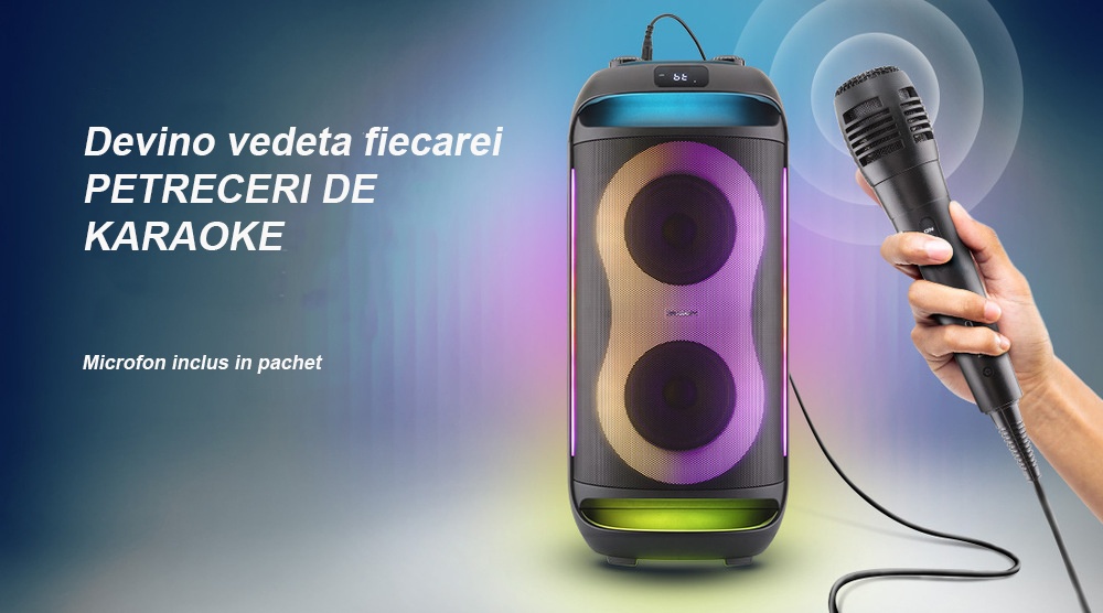 Petrecerea devine interactiva datorita functiei karaoke, microfonul fiind inclus in pachet. Indiferent daca organizezi o seara de distractie cu prietenii sau o aniversare, boxa creeaza atmosfera perfecta cu ajutorul efectelor LED integrate, sincronizate cu muzica.