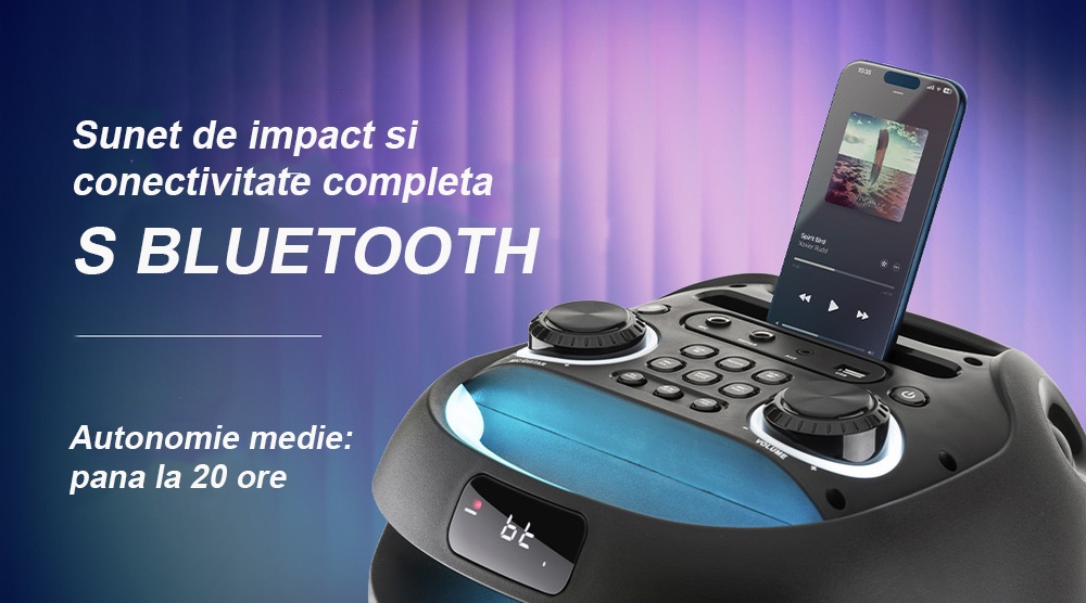 Datorita bateriei reincarcabile, boxa asigura pana la 20 ore de redare, astfel incat distractia sa nu fie intrerupta. Designul robust si manerul integrat fac transportul simplu si confortabil, iar display-ul LCD permite control rapid si intuitiv.