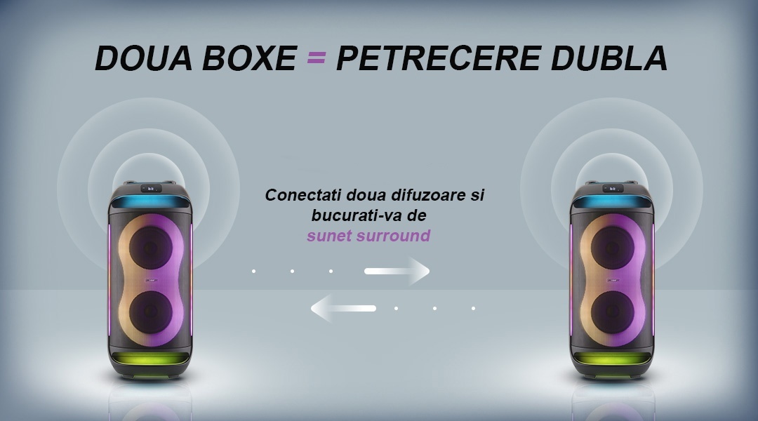 Functia TWS (True Wireless Stereo) iti permite sa conectezi doua boxe GoGEN compatibile pentru un sunet stereo amplificat, ideal pentru spatii mai mari sau evenimente in aer liber.