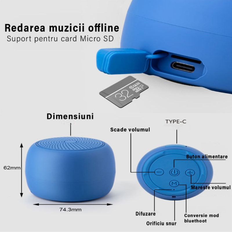 Pentru cei care prefera sa asculte muzica personala prin cardul MicroSD, aceasta boxa detine un slot dedicat. In plus, beneficiezi de un snur inclus care te ajuta sa o transporti si sa o agati in diverse locuri.