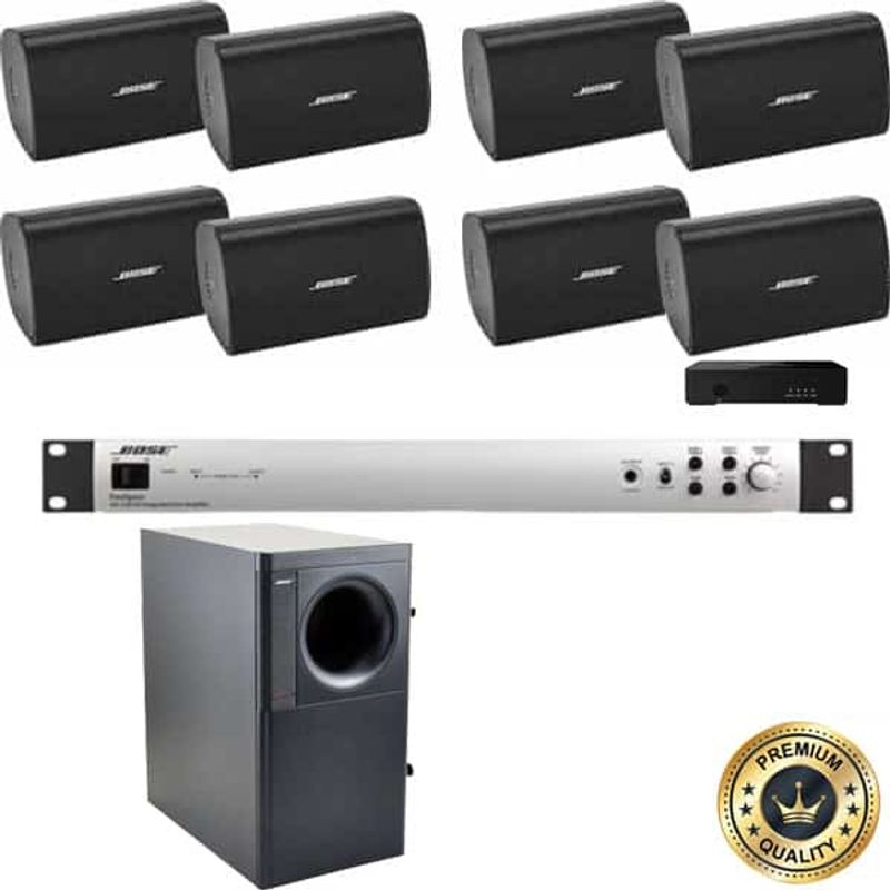 Set pentru sonorizare in sistem 100V, discret, de la brandul Bose pentru restaurante hoteluri, sali de fitness si cafenele. Pentru suprafete de pana la 170mp, impartit in 2 zone cu volum reglabil.