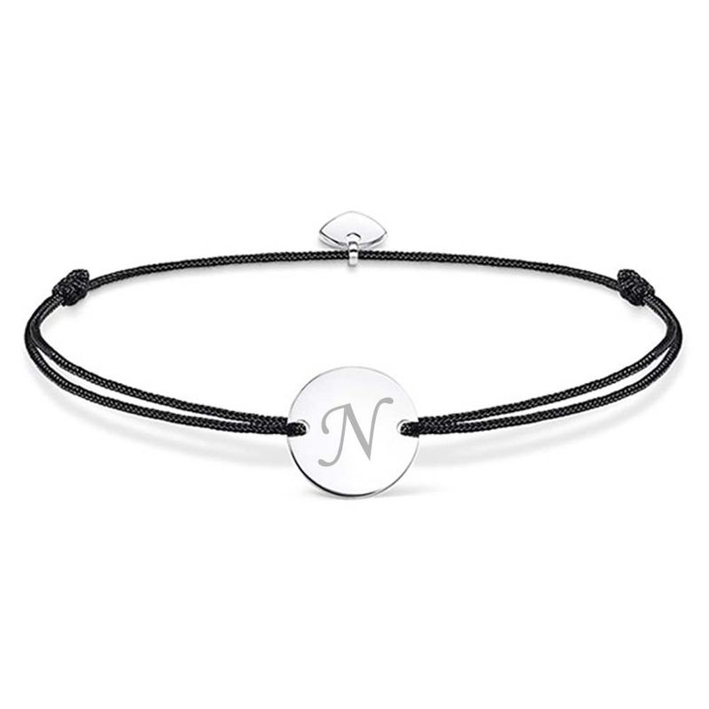 Bratara ajustabila cu banut rotund si inima, argintie, gravata cu litera, negru, este un accesoriu elegant si sofisticat, perfect pentru a adauga un plus de stil si rafinament oricarei tinute.