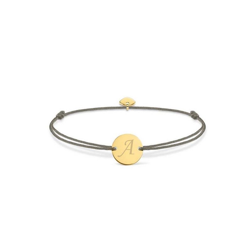 Bratara ajustabila cu banut rotund si inima, auriu, gravata cu litera, snur gri, este un accesoriu elegant si rafinat, perfect pentru a completa orice tinuta cu un strop de stralucire si stil.