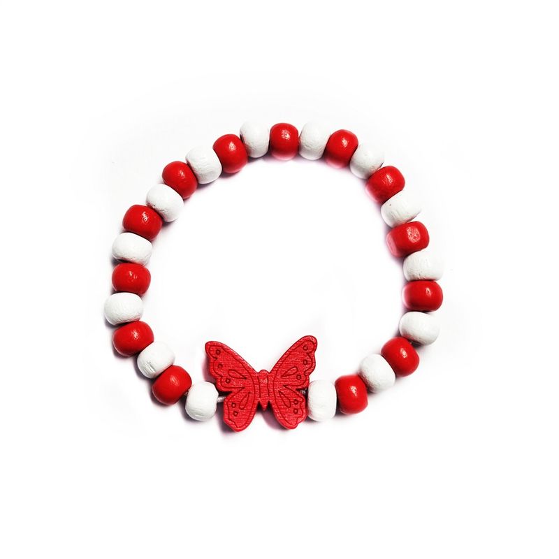 Bratara copii elastica, cu charm fluturas rosu stilizat si margelute din lemn, model 14 Bratara copii elastica, cu charm fluturas rosu stilizat si margelute din lemn, model 14