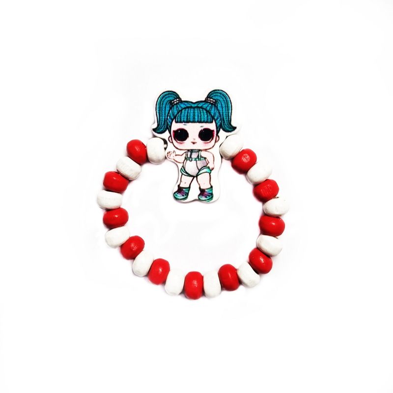 Bratara Martisor pentru copii, elastica cu fetita LOL tourquaz, cu margelute de lemn Bratara Martisor pentru copii, elastica cu fetita LOL tourquaz, cu margelute de lemn