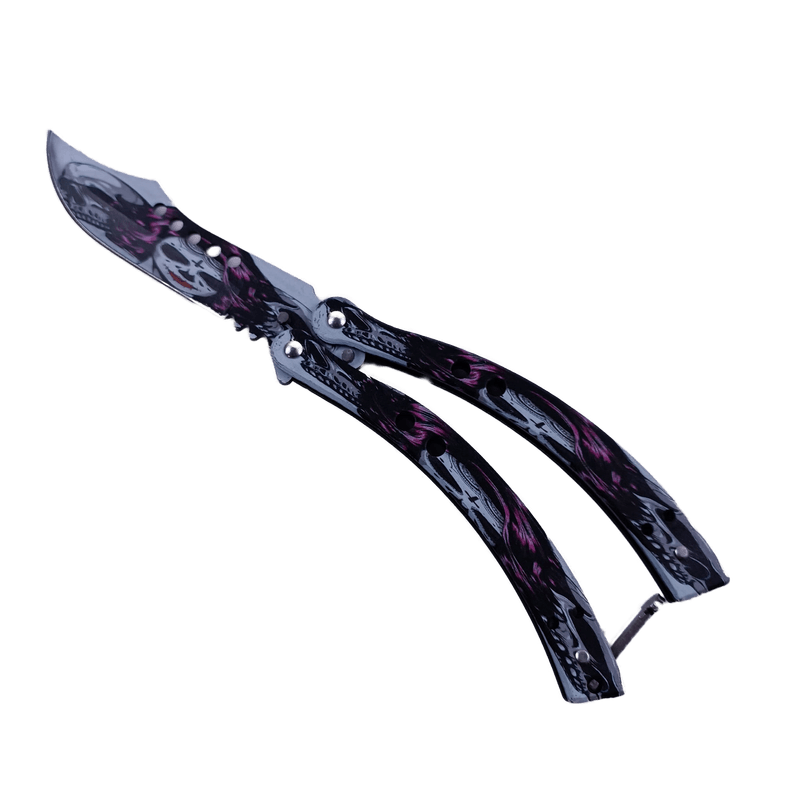 Briceagul fluture cu tais, model cu gauri in lama, cap de mort, curbatie de 22 de centimetri, intr-o varietate de culori vibrante, reprezinta o piesa distinctiva in lumea instrumentelor multifunctionale. Cu o constructie ingenioasa si o estetica intriganta, acest briceag atrage atentia prin design-ul sau unic si functionalitatea sa variata.