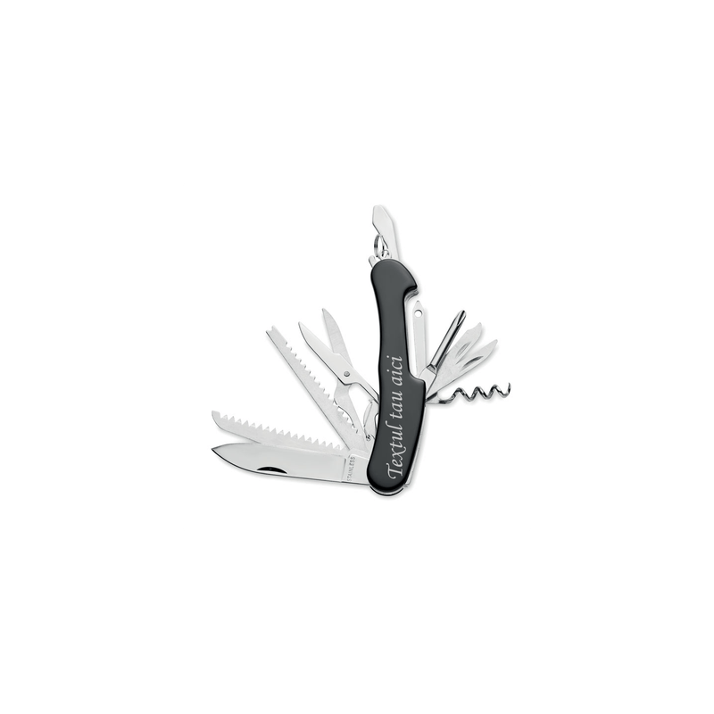 Briceag Multifunctional Negru Personalizat cu Textul Tau, 11 Functii, Otel Inoxidabil, 10.5X2X1 cm