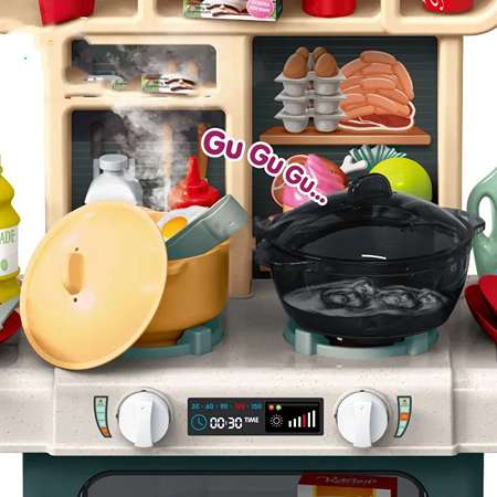 Bucatarie pentru copii WePro Store, circuit de apa real, cuptor si plita, sunete si lumini, accesorizata complet, 64 piese, Verde, 3 ani +