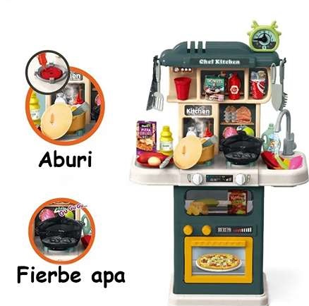 Aceasta bucatarie nu este o simpla jucarie, ci un loc magic unde micutii pot transforma ingrediente in mancaruri delicioase. Fiecare detaliu, de la efectele de sunet si lumina pana la deschiderea usii cuptorului sau rotatia butoanelor, aduce realism jocului, facand copilul sa se simta ca un bucatar adevarat in propria bucatarie.