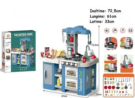 Aceasta bucatarie nu este o simpla jucarie, ci un loc magic unde micutii pot transforma ingrediente in mancaruri delicioase. Fiecare detaliu, de la efectele de sunet si lumina pana la deschiderea usii cuptorului sau rotatia butoanelor, aduce realism jocului, facand copilul sa se simta ca un bucatar adevarat in propria bucatarie.