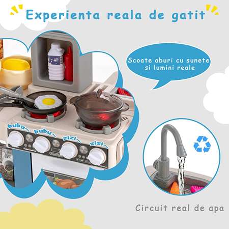 5) Experienta realista de gatit: Cand copiii rotesc butonul aragazului, acesta va emite lumini si sunete vii. Odata ce aragazul este pornit, poate produce nu numai abur, ci si fierbe apa din oala. Datorita chiuvetei de joaca cu sistem de circulatie a apei, copiii se pot preface ca spala vase dupa cina.
