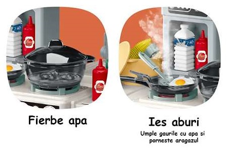 Pe aragazul poti pune un recipient special - o oala transparenta pentru „apa clocotita”. Oala are un dublu fund care creeaza un efect de fierbere: atunci cand pornesti acest aragaz, in apa apar „bule magice” si incepe sa „bulboreze” ca o supa adevarata in clocot! Soba are o indicatie luminoasa „foc care arde” si un efect sonor „fierbe si clocoteste”.