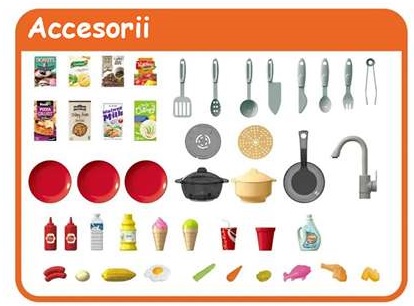 Setul contine mobilierul de bucatarie cu aragaz incorporat si chiuveta insotit de o multime de accesorii: cratita cu capac, oala cu capac, tigaie, ou, sticla, 2 sticlute gradate, pahar, 2 cornete inghetata (fiecare se asambleaza din 2 piese), 2 bidoane, morcov, porumb, cartof, pulpa si aripa de pui, peste, piesa formata din 2 carnati, legatura de verdeturi, peste, pahar bautura, paleta, lingura pentru paste, cleste, cutit, polonic, paleta, cu perforatii, cutit mare, lingura, furculita.