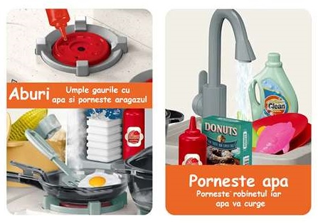 Aceasta bucatarie nu este o simpla jucarie, ci un loc magic unde micutii pot transforma ingrediente in mancaruri delicioase. Fiecare detaliu, de la efectele de sunet si lumina pana la deschiderea usii cuptorului sau rotatia butoanelor, aduce realism jocului, facand copilul sa se simta ca un bucatar adevarat in propria bucatarie.