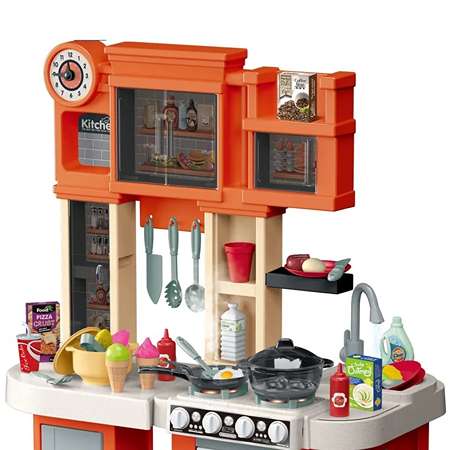 Bucatarie pentru copii WePro Store, lumini si sunete reale, functie de apa curgatoare si abur, 75 accesorii de gatit, Portocalie, 3 ani +