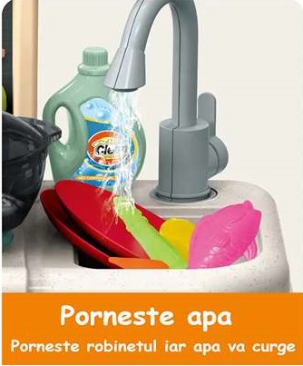 In timpul jocului, puteti chiar sa spalati vasele. Doar turnati 1 cana de apa in chiuveta, intoarceti manerul robinetului - apa incepe sa curga din ea. Apa poate fi turnata intr-o oala sau pahar din setul de accesorii inclus.
