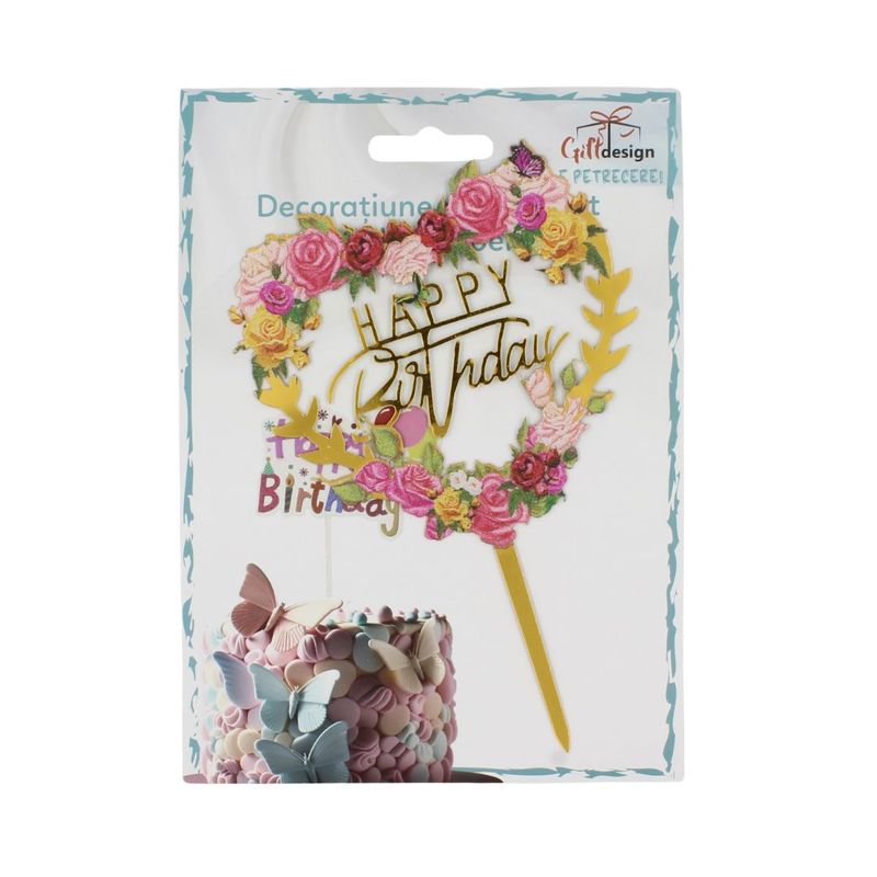 Transformati tortul de sarbatoare intr-o opera delicata si plina de bucurie cu acest Cake Topper ce prezinta o inimioara inconjurata de floricele, completata de mesajul "Happy Birthday". Acest accesoriu adauga un strop de romantism si eleganta evenimentului, marcand cu stil momentul dulce al sarbatorii.