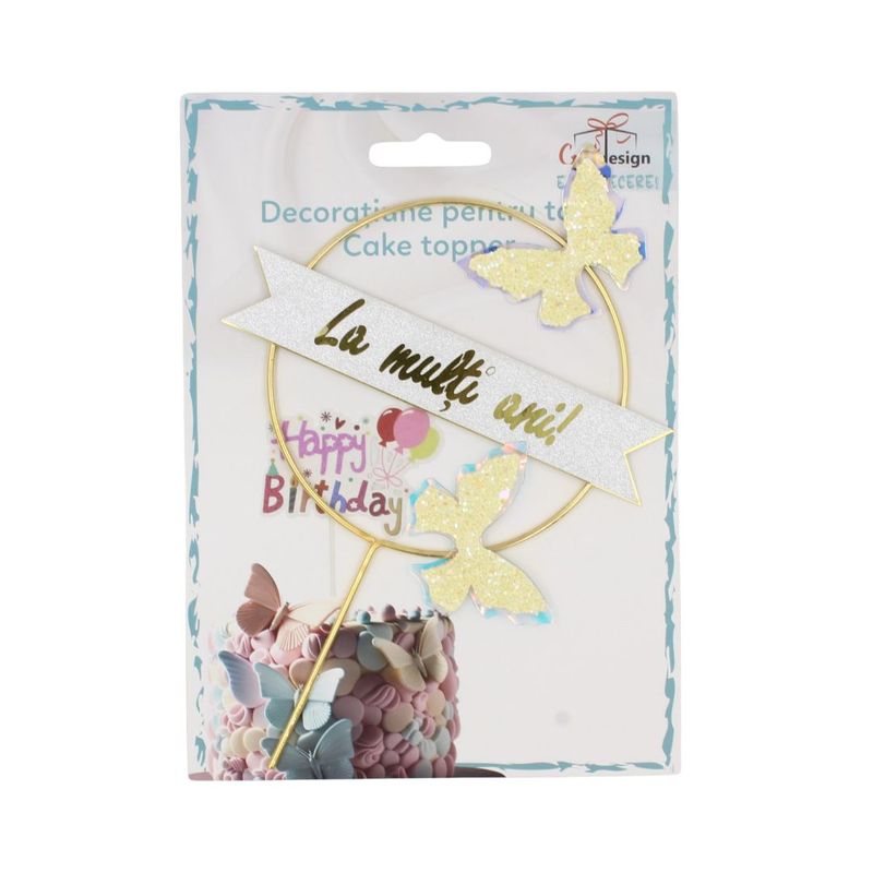 Adauga stralucire si eleganta tortului de sarbatoare cu acest Cake Topper in forma de cerc auriu, decorat cu fluturasi si mesajul festiv "La Multi Ani". Acest accesoriu aduce un farmec aparte evenimentului, fiind ideal pentru aniversari sau orice alt moment special ce merita sarbatorit intr-un mod stralucitor si elegant.