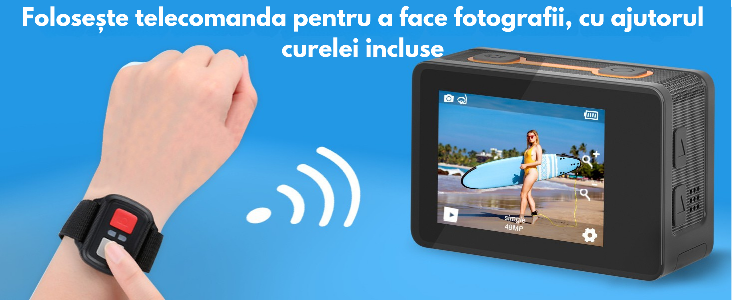 Folosind telecomanda cu curea reglabila, poti face poze sau incepe filmarea de la distanta. Ideala pentru sporturi, montari pe casca sau bicicleta.