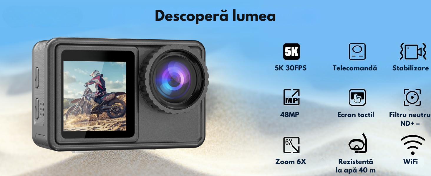 Camera de Actiune 5K Ultra HD, Dasbo®, Ecran Dublu, Wifi + Aplicatie, 48MP, Rezistenta la Apa 30M, Telecomanda, Stabilizare EIS, Ecran dublu touch screen 2”+1.4”, Unghi Larg 170°, Senzor imagine Sony, Zoom 6x, 2 Baterii + Incarcator dublu si Accesorii