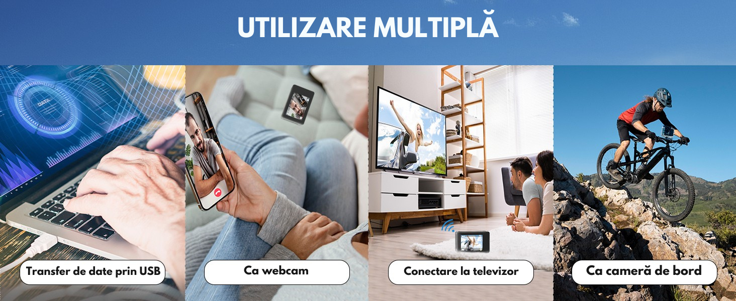 Aceasta camera multifunctionala poate fi folosita si ca webcam pentru videoconferinte, camera auto (dash cam), se conecteaza usor la televizor si transfera rapid datele prin cablu USB.