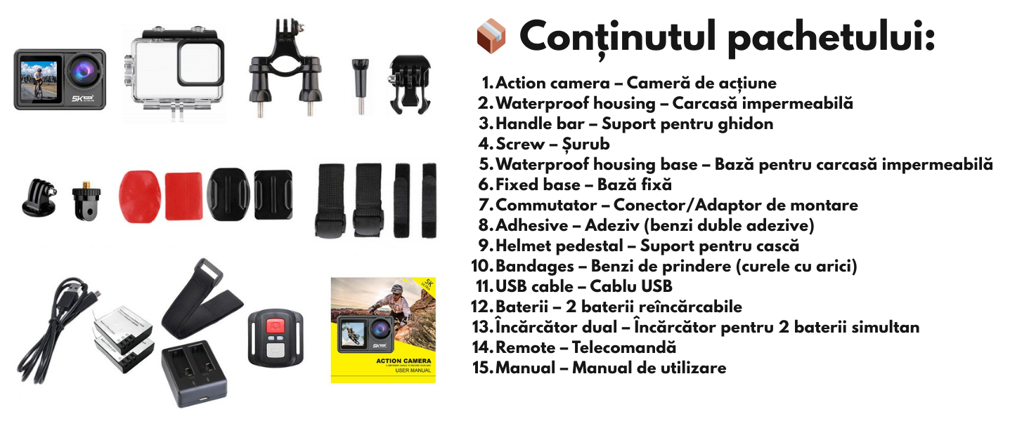 Tot ce ai nevoie este in cutie: carcasa impermeabila, curele, suport pentru casca, ghidon, incarcator dual, 2 baterii, telecomanda, cablu USB si manual de utilizare.