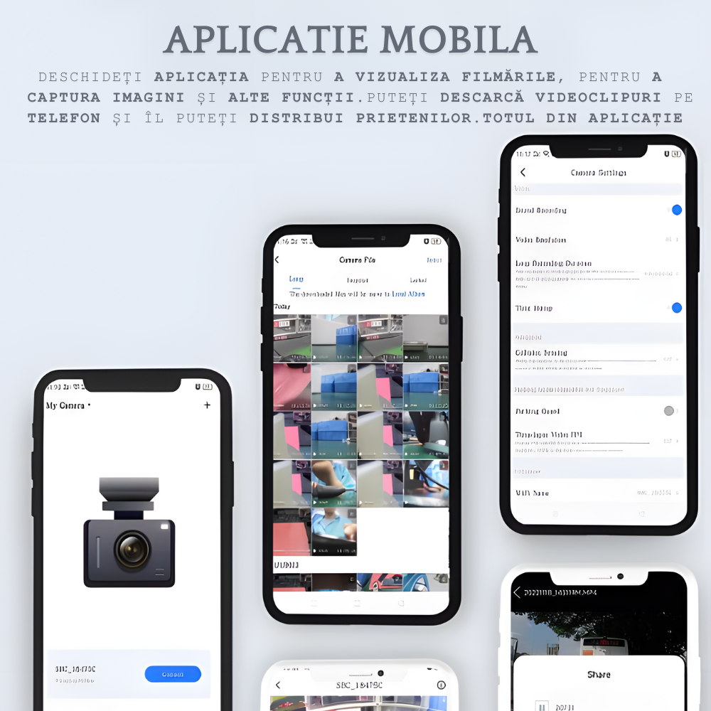 Conexiune Mobila: Camera de bord vine cu o aplicatie mobila dedicata care iti permite sa controlezi si sa gestionezi cu usurinta toate inregistrarile. Poti accesa si descarca videoclipurile direct de pe telefonul tau, oriunde te afli, fara sa ai nevoie de un computer.