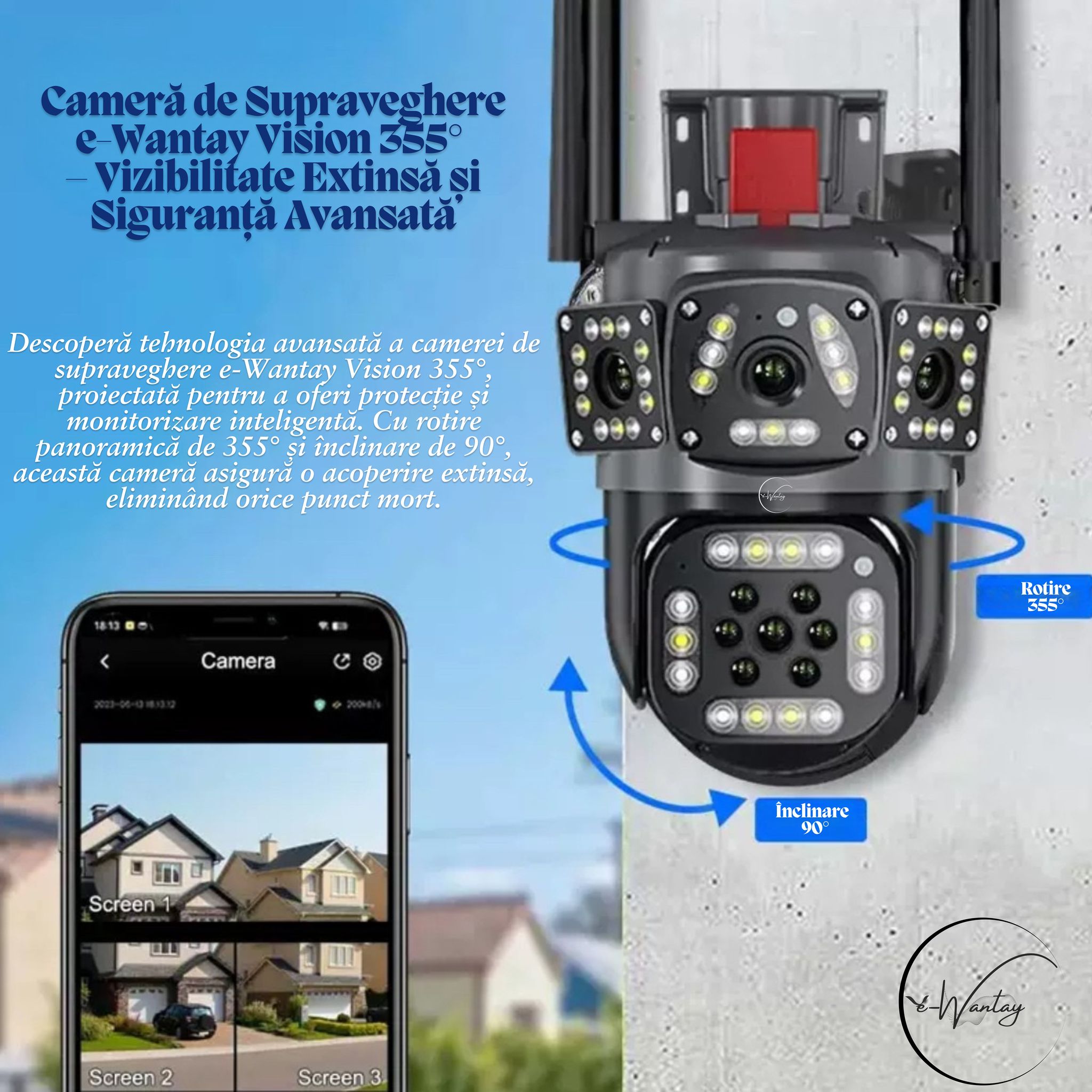 Descopera tehnologia avansata a e-Wantay® Vision 355°, o camera de supraveghere inteligenta 2 in 1, ideala pentru monitorizarea casei, curtii, biroului sau magazinului tau. Cu vizualizare panoramica de 355° si inclinare de 90°, aceasta camera elimina unghiurile moarte, oferind siguranta completa, zi si noapte.