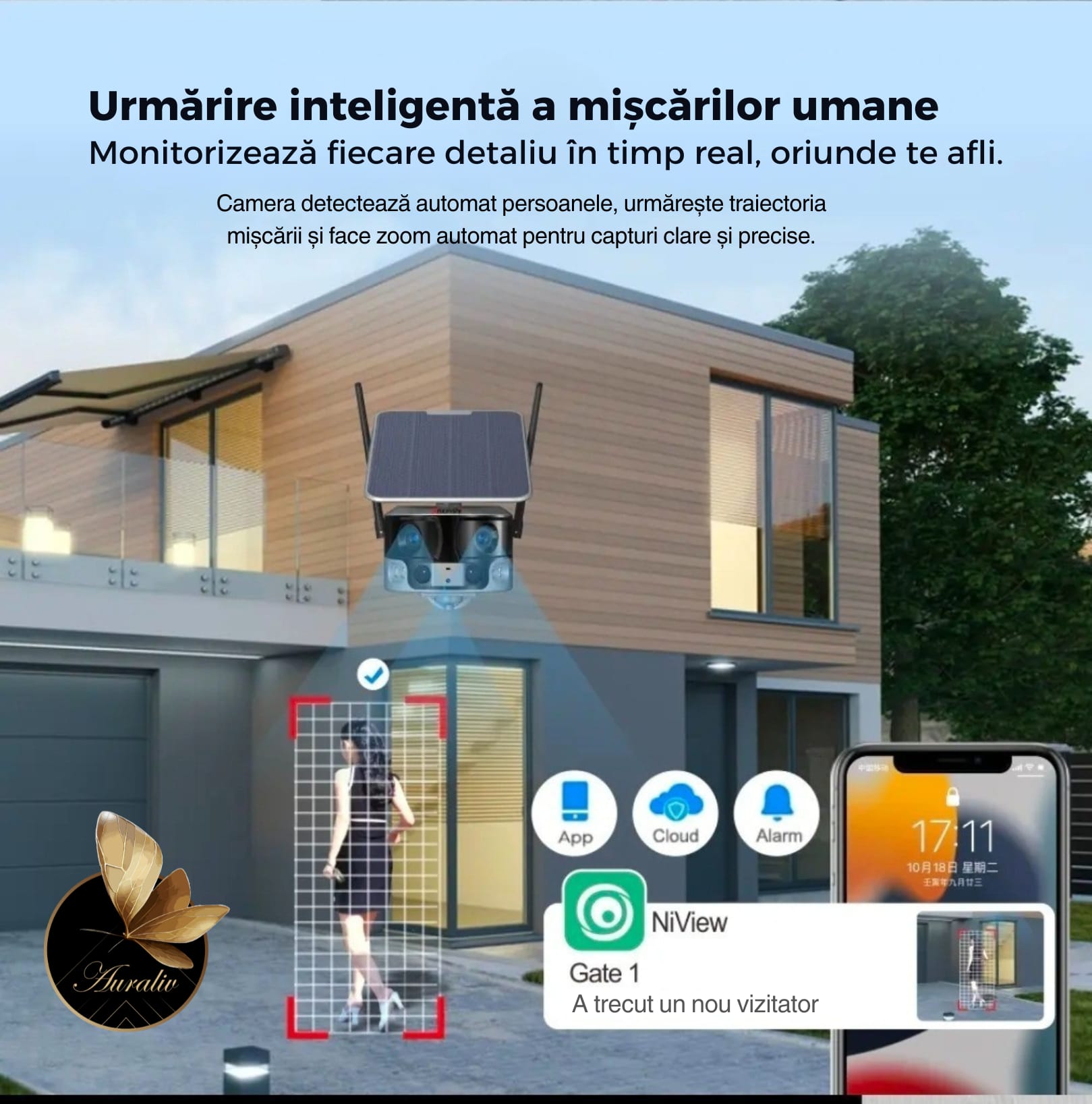 Camera Solara WiFi 4K Dual Lens 180° Auraliv® cu Detectie Umana PIR, Alarma Inteligenta, Viziune Nocturna Color, Audio Bidirectional, Impermeabila IP66, Panou Solar Integrat si Conectare prin Aplicatie