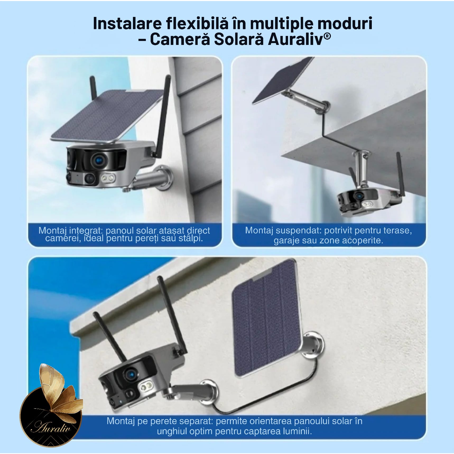 - Instalare Multiplu Flexibila – pe perete, tavan sau cu panou solar separat, in functie de locatie.