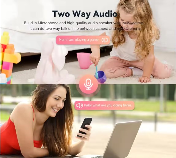 Cu ajutorul microfonului incorporat si functia de detectie miscare, puteti sa auziti si sa vedeti tot ce se intampla in camera.