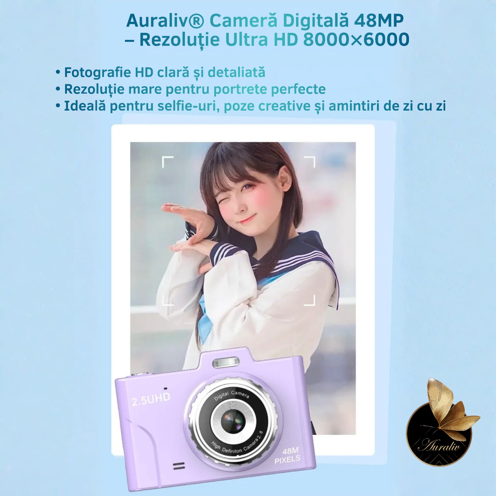 Camera Foto Digitala Auraliv® Roz redefineste conceptul de camera compacta, combinand un design modern, sofisticat si feminin cu performante avansate, potrivite pentru utilizare zilnica, calatorii, fotografie artistica, social media si continut digital de calitate.