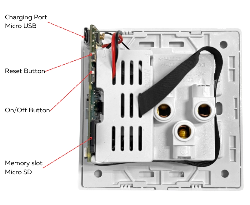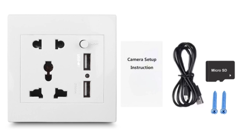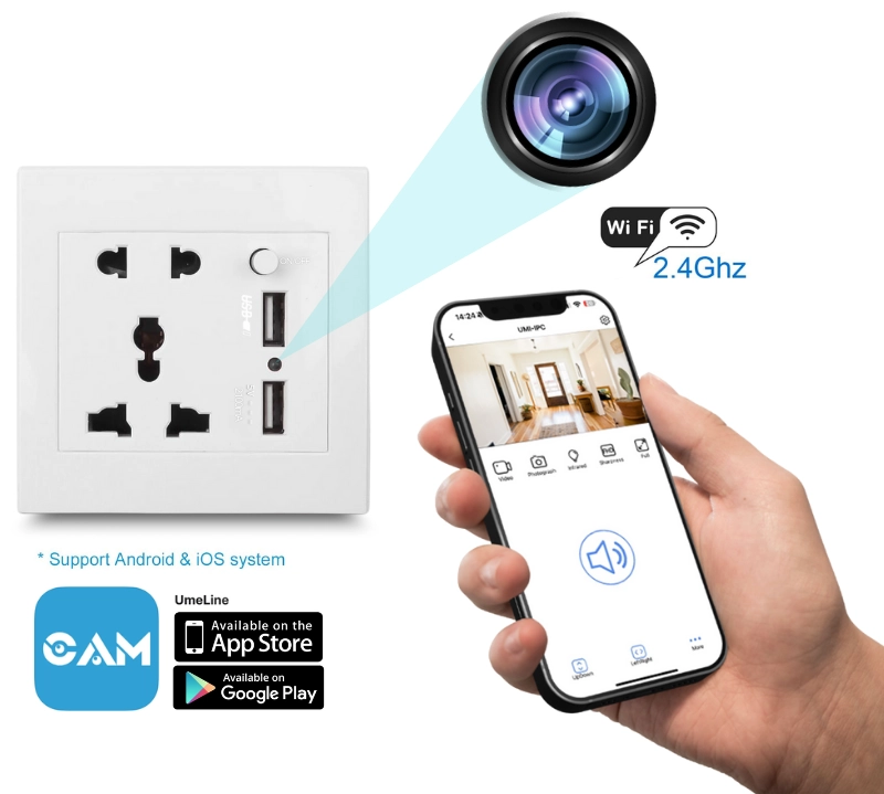 Camera este pozitionata discret in carcasa prizei, astfel incat sa nu atraga atentia. Aceasta filmeaza in rezolutie Full HD 1080p, cu un unghi larg de vizualizare de 90° si poate fi configurata pentru inregistrare continua pe un card microSD(este inclus) sau transmitere in timp real prin Wi-Fi.