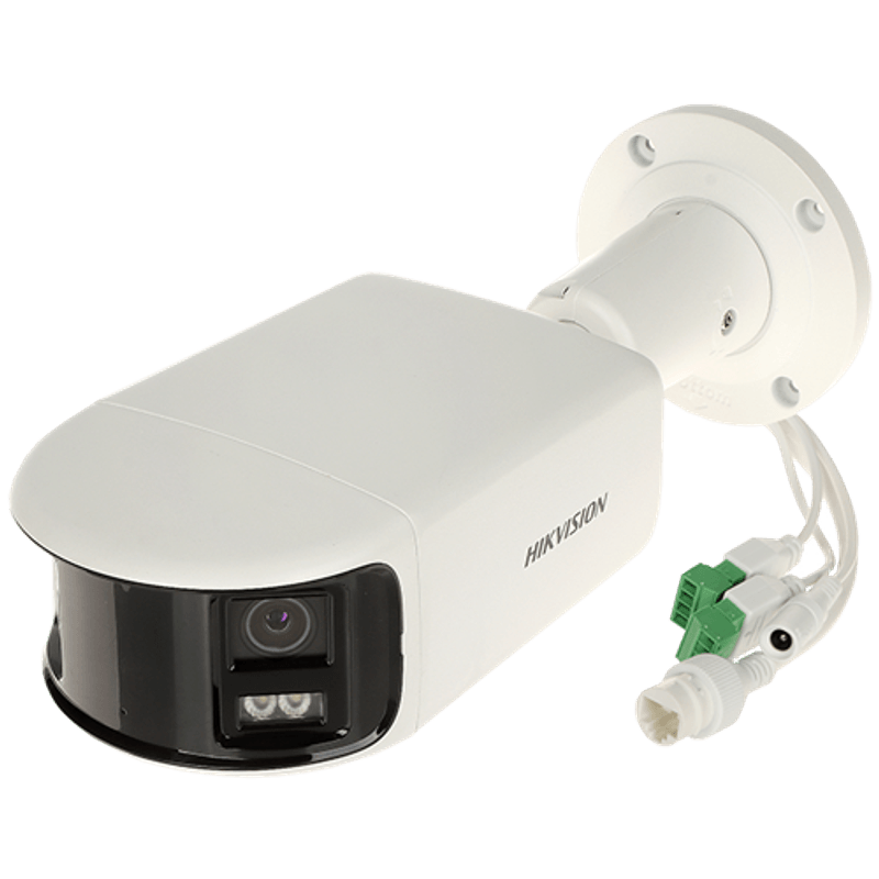 este o camera IP, de 8MP (5120 x 1440) de la Hikvision, formata din 2 obiective care preiau imaginile si le suprapun partial pentru a forma o imagine panoramica (180 A°).