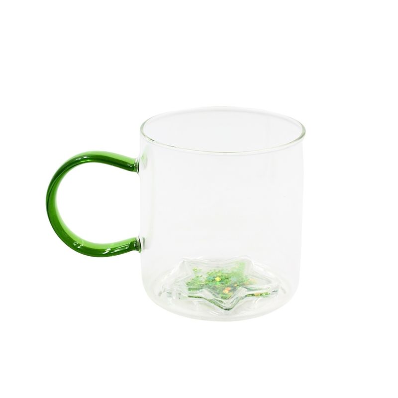 Casa si GradinaBucatarie si veselaCani si pahareCani si cestiCana cu model 3D steluta verde, pereti dubli, sticla borosilicata si insertie de sclipici, 300 ml, Aurora Glow