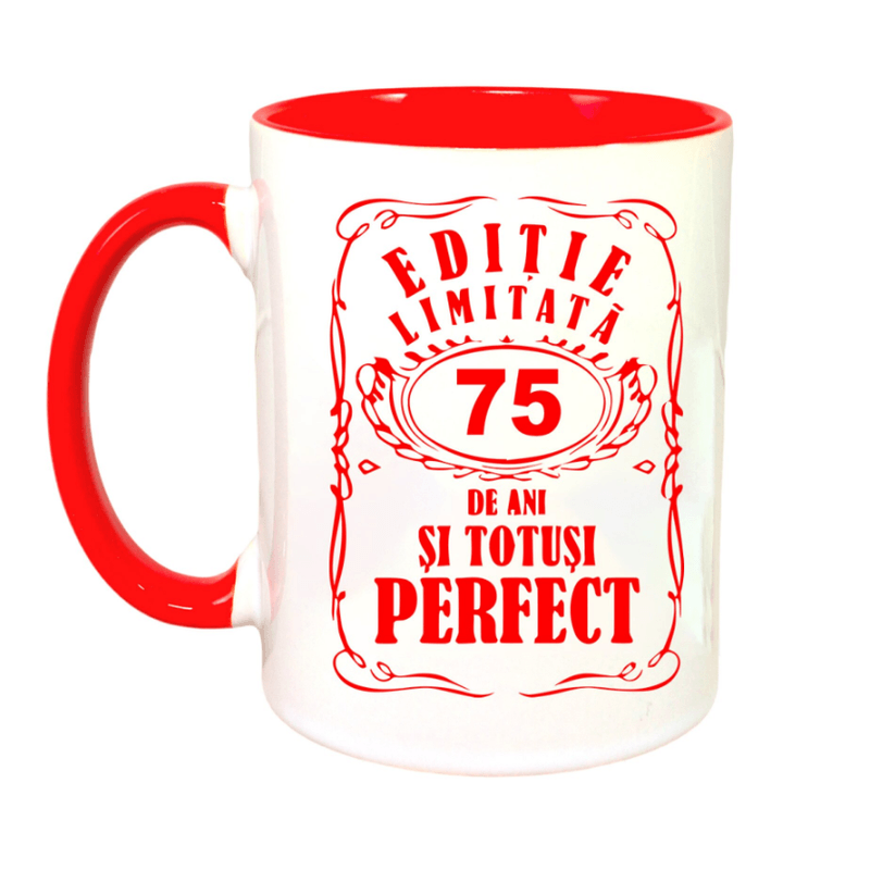 Cana maner rosu personalizata "Editie limitata-75 ani", INOVATIX®. 330ml Cana maner rosu personalizata "Editie limitata-75 ani", INOVATIX®. 330ml