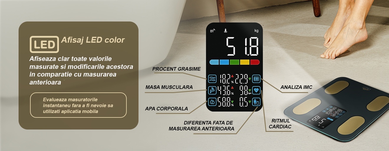 - Cantarire instantanee – pornire automata la urcarea pe cantar