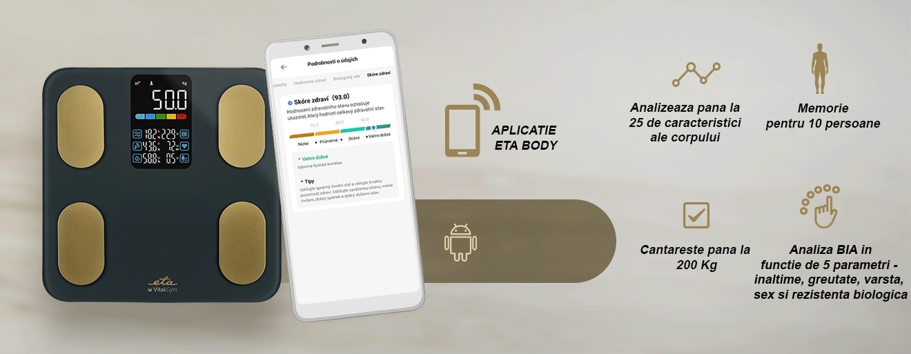 Alege cantarul analitic ETA Vital Gym si transforma fiecare masuratoare intr-un pas real spre un stil de viata mai sanatos. Cu analiza corporala avansata, conectivitate smart, precizie ridicata si un design elegant, acest cantar iti ofera control complet asupra evolutiei tale fizice. Fie ca iti doresti sa slabesti, sa iti mentii forma sau sa iti monitorizezi sanatatea zilnic, ETA Vital Gym este partenerul ideal, usor de folosit si mereu pregatit sa iti ofere rezultate clare si relevante. Investeste in tine si urmareste-ti progresul inteligent, zi de zi.