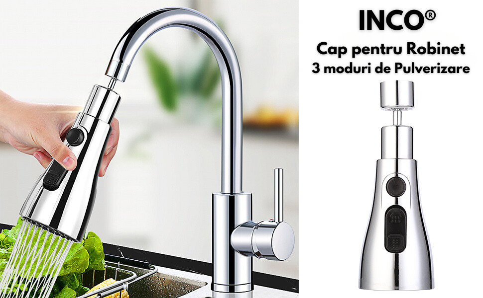 Cap pentru Robinet, INCO®, Adaptor Universal si flexibil pentru Baterie, Extractabil cu Presiune Ajustabila si 3 moduri de Pulverizare, Anti-Stropire, Design Modern si Ergonomic din Inox, Rotire 360°, Economisire a apei, pentru Bucatarie, Baie, Gri