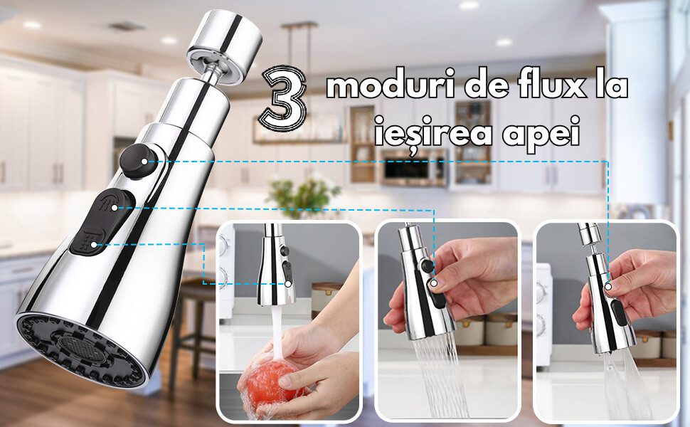 - Atasamentul robinetului poate fi ajustat la 3 moduri diferite de debit de apa pentru a comuta la modul dorit de economisire a apei, amplificare sau pulverizare pentru diferite cerinte de spalare.