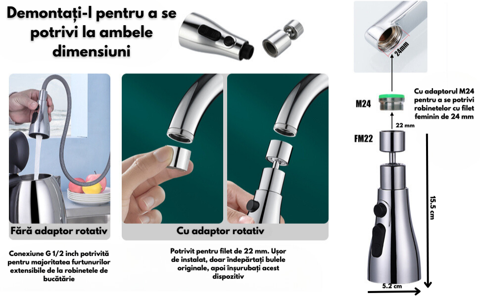 - Compatibilitate Universala: Se poate monta usor pe majoritatea tipurilor de baterii de bucatarie standard, fara a necesita unelte speciale sau cunostinte tehnice avansate.
