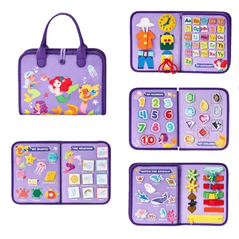 In primii ani din viata, copii descopera lumea inconjuratoare cu ajutorul manilor. Diferitele texturi, multitudinea de culori si forme il vor incuraja sa exploreze lucrurile noi. Aceasta jucarie il va ajuta sa isi dezvolte functiile motorii si gandirea. Aceasta carte de activitati Montessori este realizata din pasla de inalta calitate si robusta, care nu se va rupe usor si va dura mult timp. Cusaturile sunt toate foarte bine realizate, nu irita piele, sunt ferme si durabile. Piesele sunt toate bine atasate, moi, flexibile si usoare, colorate si foarte provocatoare. Mainile copilului sunt protejate de marginile netede, iar punctele adezive usor de asortat sunt dure si nu se dezlipesc. Copilul va experimenta cum sa utilizeze curelele, nasturii rucsacului, capsele portofelului, velcro si ai diverselor piese de imbracaminte, precum si a altor necesitati zilnice, cum sa inchida fermoarul, sa lege sireturiles si sa invete ceasul. De asemenea va invata sa recunoasca culorile, literele, cifrele si isi va dezvolta abilitatile motorii fine. Cartea are 8 pagini de activitati. Este un instrument excelent pentru a ajuta copiii mici sa invete prin joc, o carte Montessori ce il va tine pe copil ocuat si interesat sa descopere lucruri noi. Ajuta la imbunatatirea memoriei, a coordonarii ochi-mana, a motricitatii fine, a limbajului si a abilitatilor de rezolvare a problemelor. Este a jucaria perfecta pentru calatorie perfecta, in calatoriile lungi cu masina sau avionul. Ofera o experienta de invatare distractiva si interactiva pentru educatia timpurie. Este prevazuta cu un maner pentru transport. Aceasta jucarie Montessori este conceputa pentru a fi forma preferata a copilului. Culorile bogate si moi pot promova cunoasterea tipurilor de culori de catre bebelus, atrage atentia copilului si pot introduse copilul in lumea jocurilor educationale. Este o jucarie usoara si portabila, poate fi folosita in patut, carucior, scaun auto, scaun de avion, potrivita ca jucarie de calatorie pentru copii. Specificatii Material : fetru Culoare : Multicolor Dimensiuni carte 28.5 x 22.8 x 5.5 cm; 510 g (inchisa). Varsta recomandata 3 ani + Contine piese mari, special dimensionate pentru mainile mici ale copilului. Muchiile sunt rotunjite pentru siguranta copilului. Atentie! Pana la varsta de 3 ani scoateti toate piesele mici si adaugati-le dupa ce bebe nu mai baga in gurita lucruri. Produsul include piese mici, ce pot fi inghitite si pot provoca sufocare.