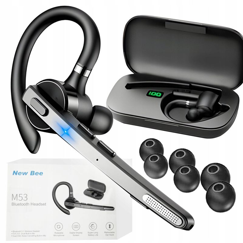 Casca Bluetooth Wireless New Bee , Bluetooth 5.1, Anulare zgomot, Cu carcasa de incarcare, Sunet HD, Multipoint, Autonomie baterie 60 ore, 10m, 13.6 grame, Buton mute, Negru