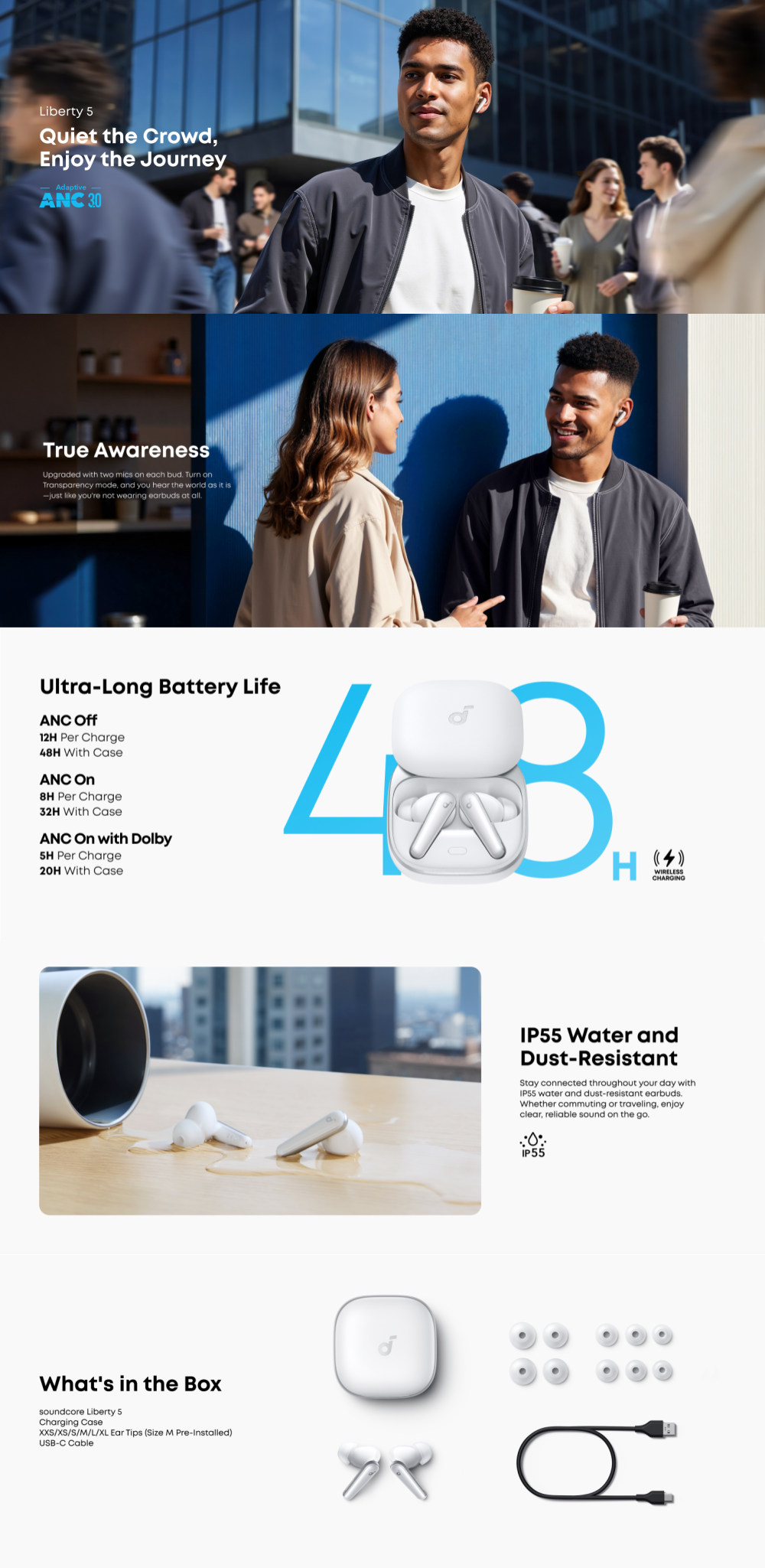 Cu Dolby Audio de top in industrie si moduri personalizate pentru muzica, filme si podcasturi, castile wireless Liberty 5 va pun pe scaunul din fata al oricarei reprezentatii.