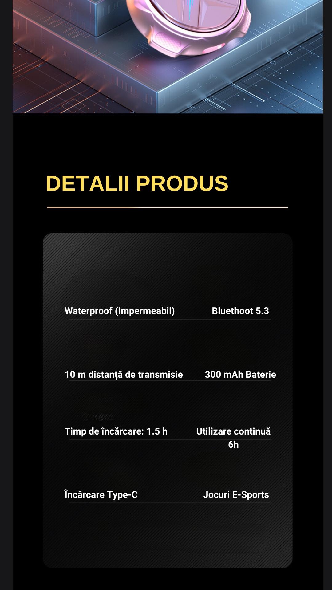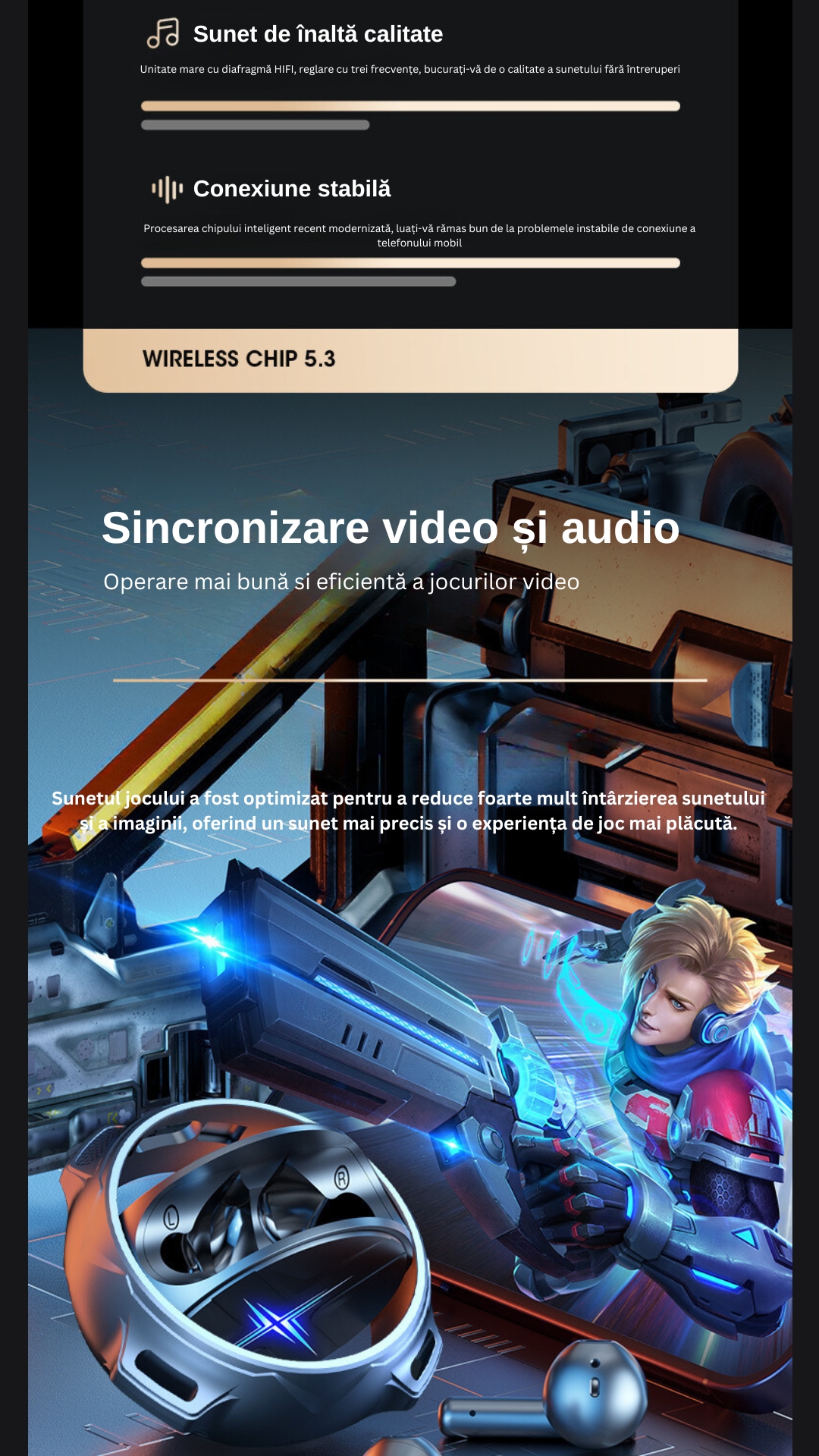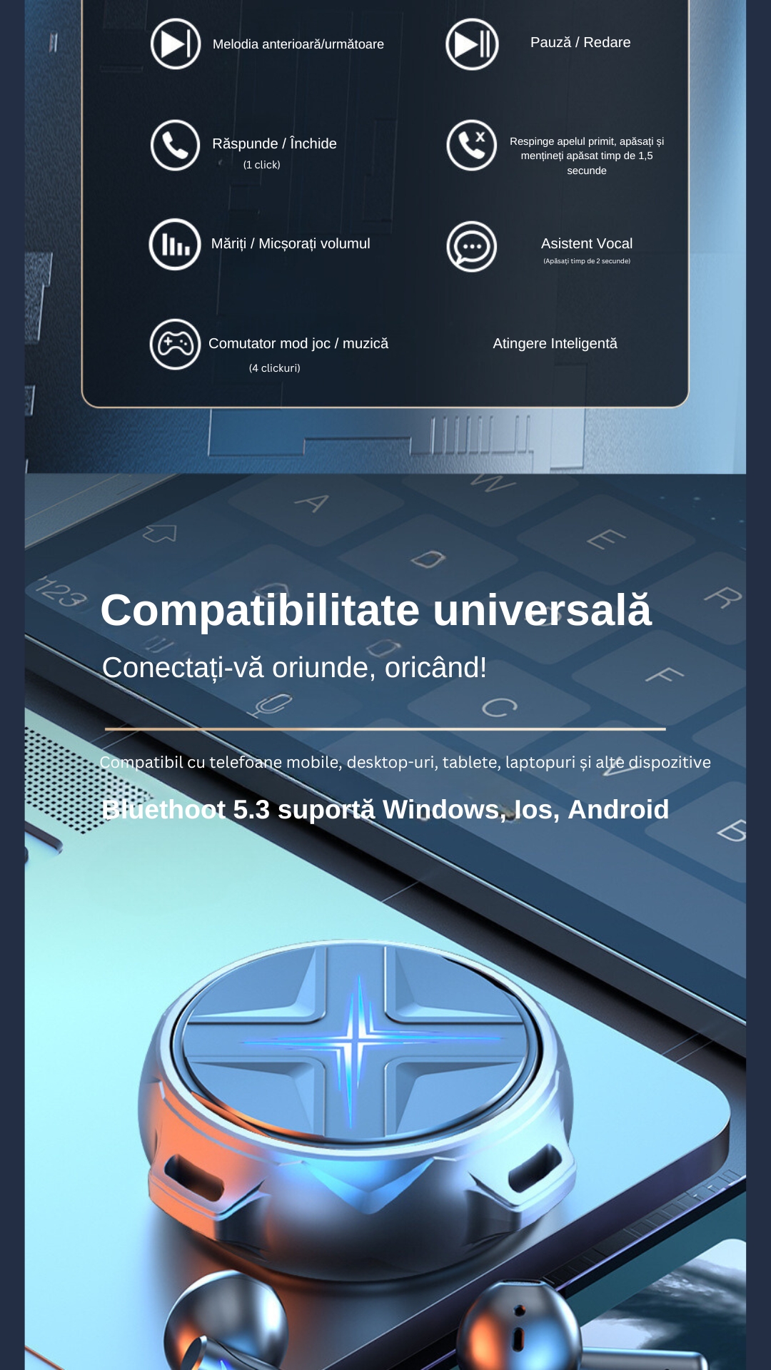-Bluetooth 5.3: Conexiune stabila si performanta audio imbunatatita;