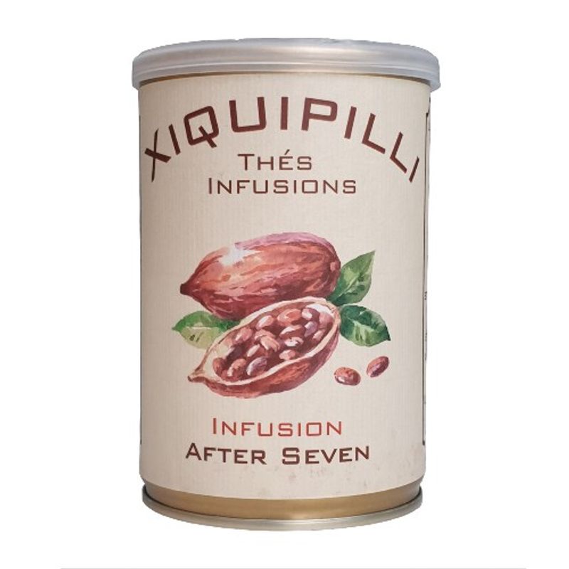 Xiquipilli After Seven este un ceai desert unic, perfect pentru o conversatie placuta dupa cina sau in orice moment al zilei cand ai pofta de ceva dulce. Ceaiul te ispiteste cu arome de ciocolata si alune caramelizate echilibrate de o nota finala mentolata. Ingredientele includ roiboos, alune caramelizate, ciocolata, arome naturale si menta. Cu un continut ridicat de antioxidanti, rooibos-ul sau “ceaiul rosu African” se combina perfect cu aroma delicata de ciocolata si cea intensa de menta pentru un moment de rasfat.
