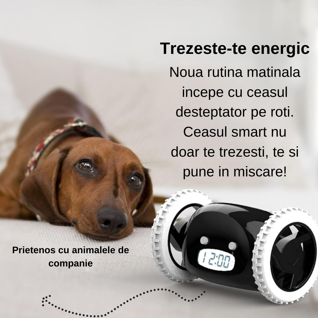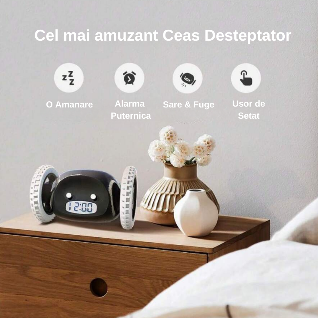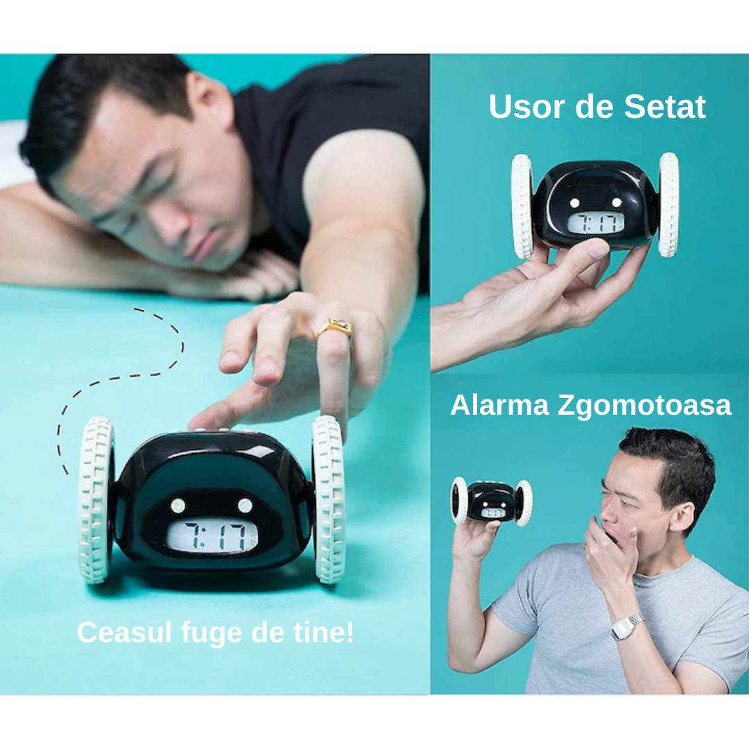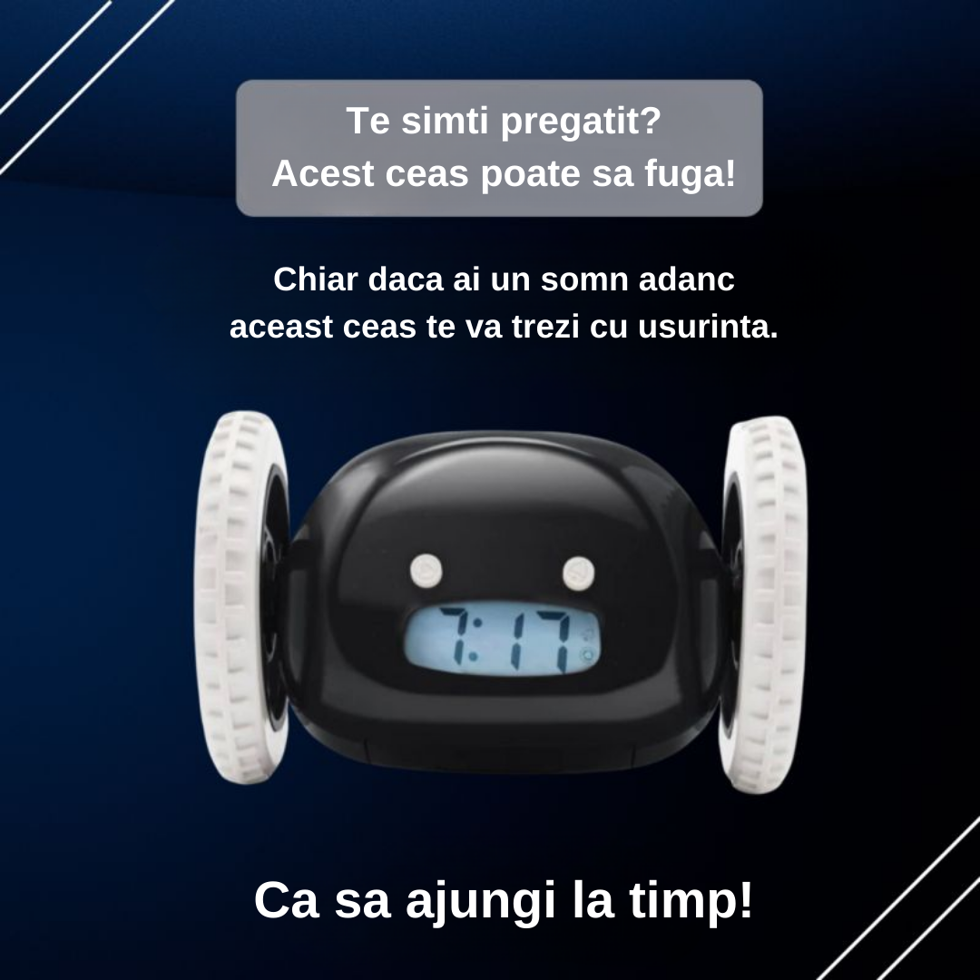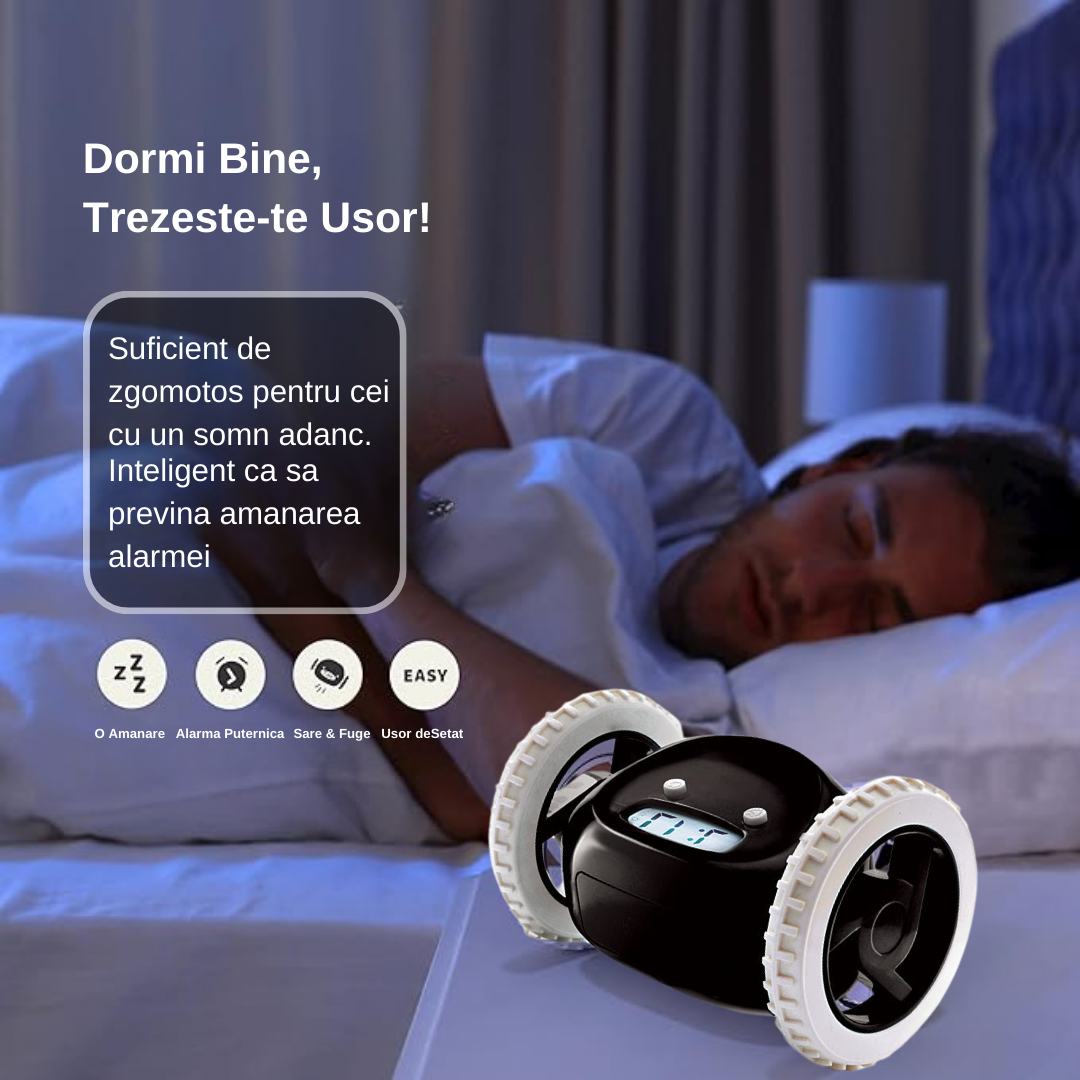 Nu mai amana alarma! Trezeste-te si nu mai intarzia! Cel mai original ceas cu alarma fugitiv pe roti. Se va rostogoli, va sari de pe noptiera ta (pana la o noptiera de 90 cm inaltime) si se va deplasa prin camera pe roti, obligandu-te sa te dai jos din pat la timp, de fi ecare data! E cool, distractiv, putin enervant, unic si nebun. Nu mai abuza de amanare! Se deplaseaza (pe covor sau lemn), vibreaza, alearga, isi schimba directia. Te vei ridica din pat ca sa il opresti.