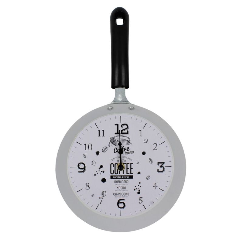 Ceas perete tigaie alba Coffee menu este un accesoriu interesant pentru casa. Poate adauga un element de farmec si originalitate in decorul unei incaperi. Aceste ceasuri sunt realizate pentru a arata ca o tigaie in miniatura. Ceasurile au limbi pentru ore si minute si un cadran central care indica timpul.